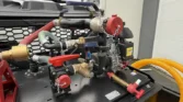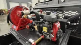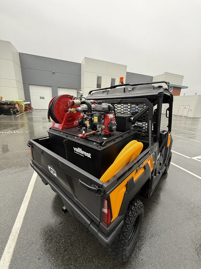 Mounted in the rear is a custom Vallfirest UTV Fire Suppression Skid Unit, engineered for efficiency and reliability in active fire scenarios. The system features an 85-gallon welded copolymer tank with internal baffles for stability over uneven terrain, paired with a high-performance 1-stage centrifugal pump capable of delivering up to 68.7 gallons per minute at 100 PSI. Powered by a dependable Honda GXH50 4-stroke engine, this setup provides consistent pressure and flow for effective firefighting and suppression tasks.